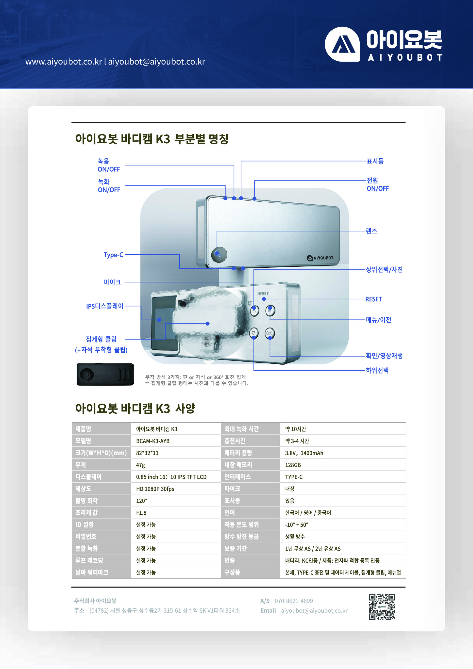 아이요봇 바디캠 K3은 초소형 명찰형 바디캠으로 약 47g의 초경량 바디와 슬림한 크기로 간편한 휴대성과 착용 편의성을 갖춘 제품입니다.