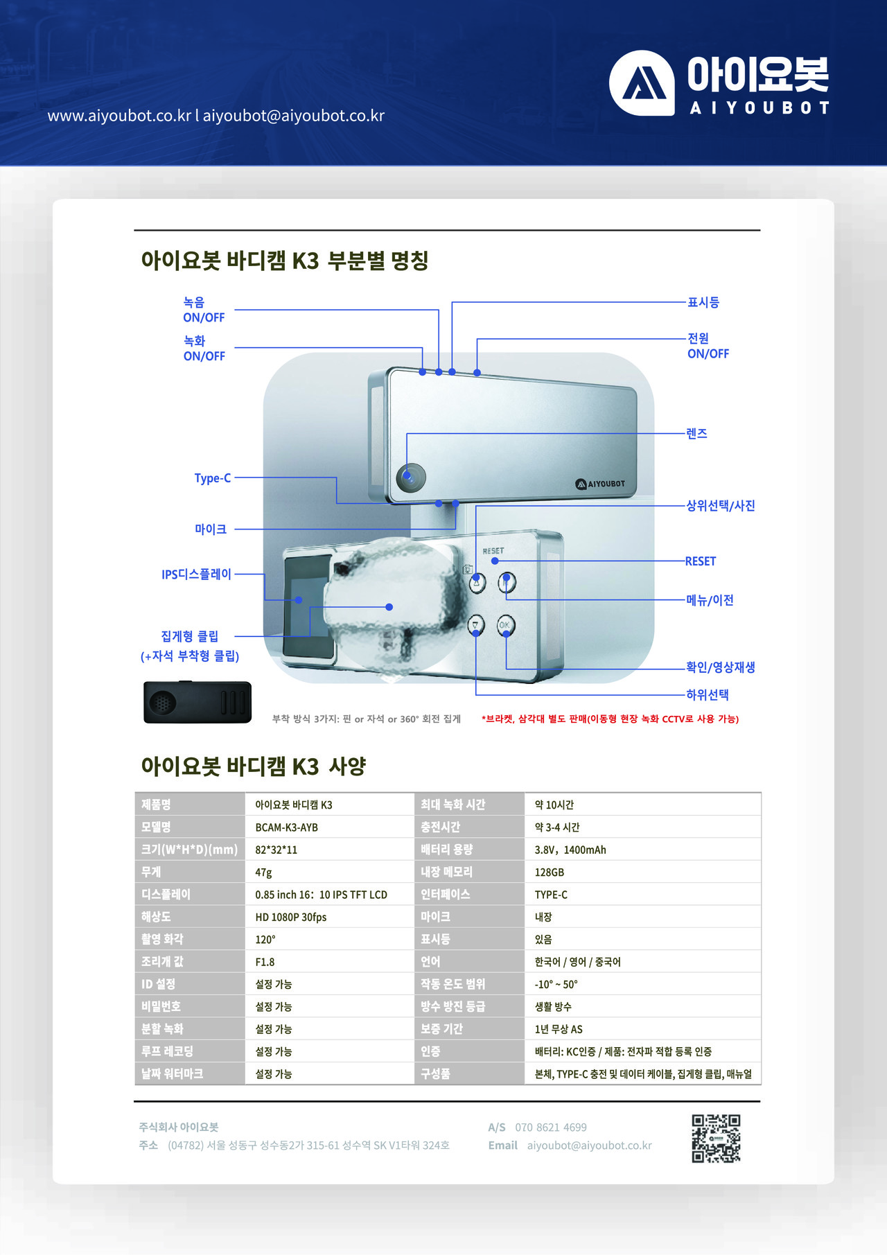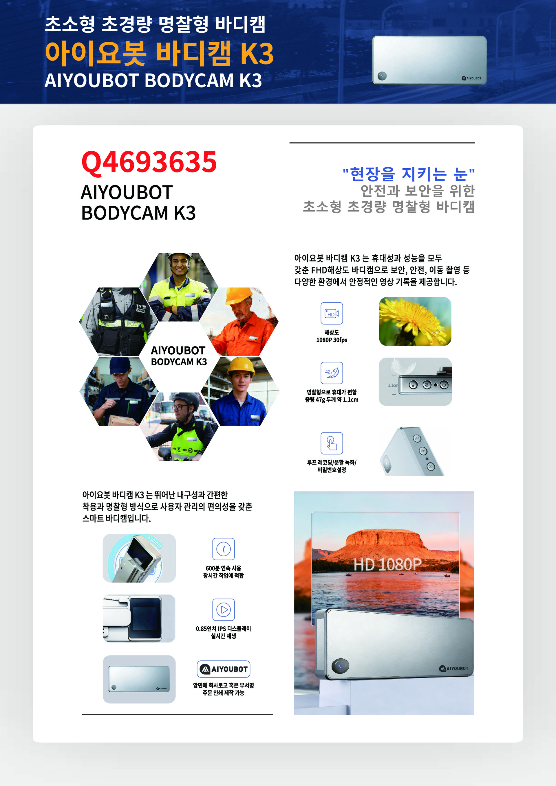 아이요봇 바디캠 K3은 초소형 명찰형 바디캠으로 약 47g의 초경량 바디와 슬림한 크기로 간편한 휴대성과 착용 편의성을 갖춘 제품입니다.