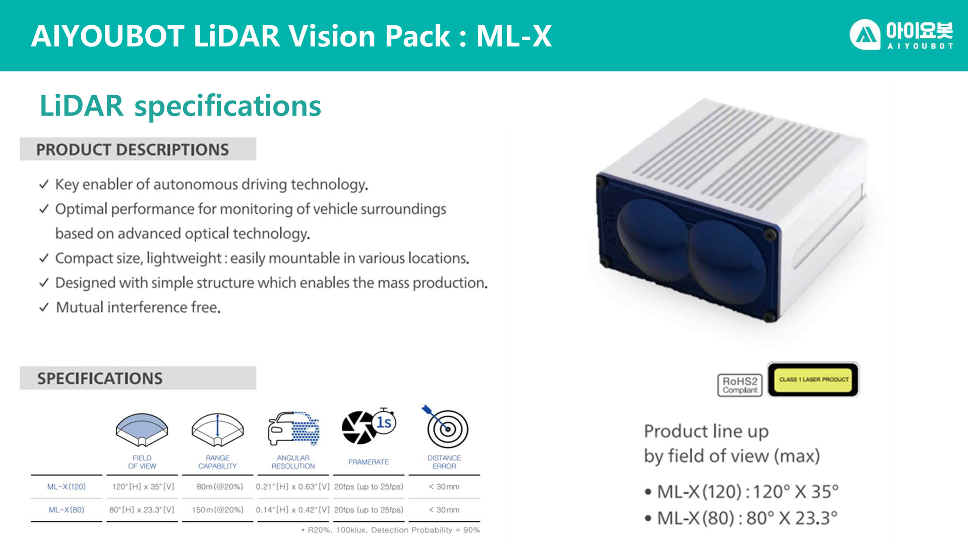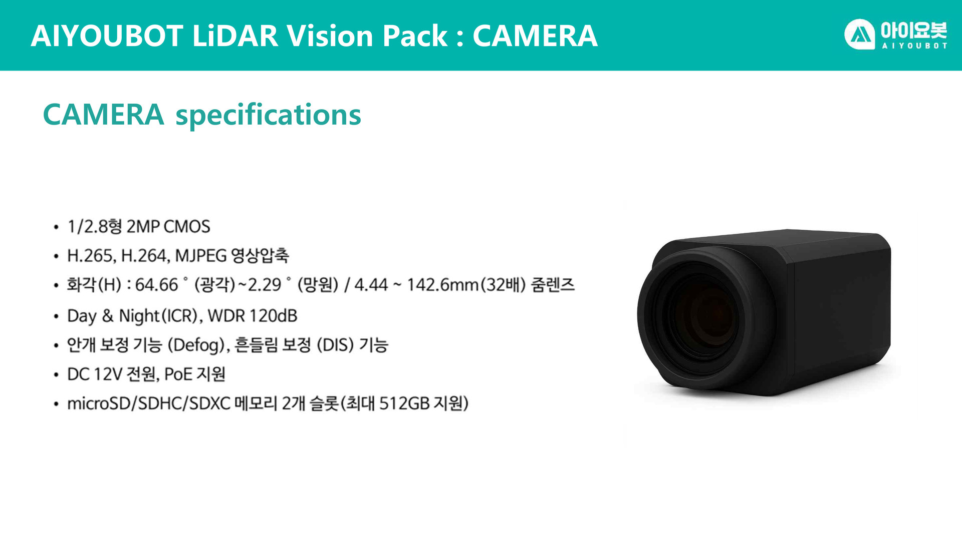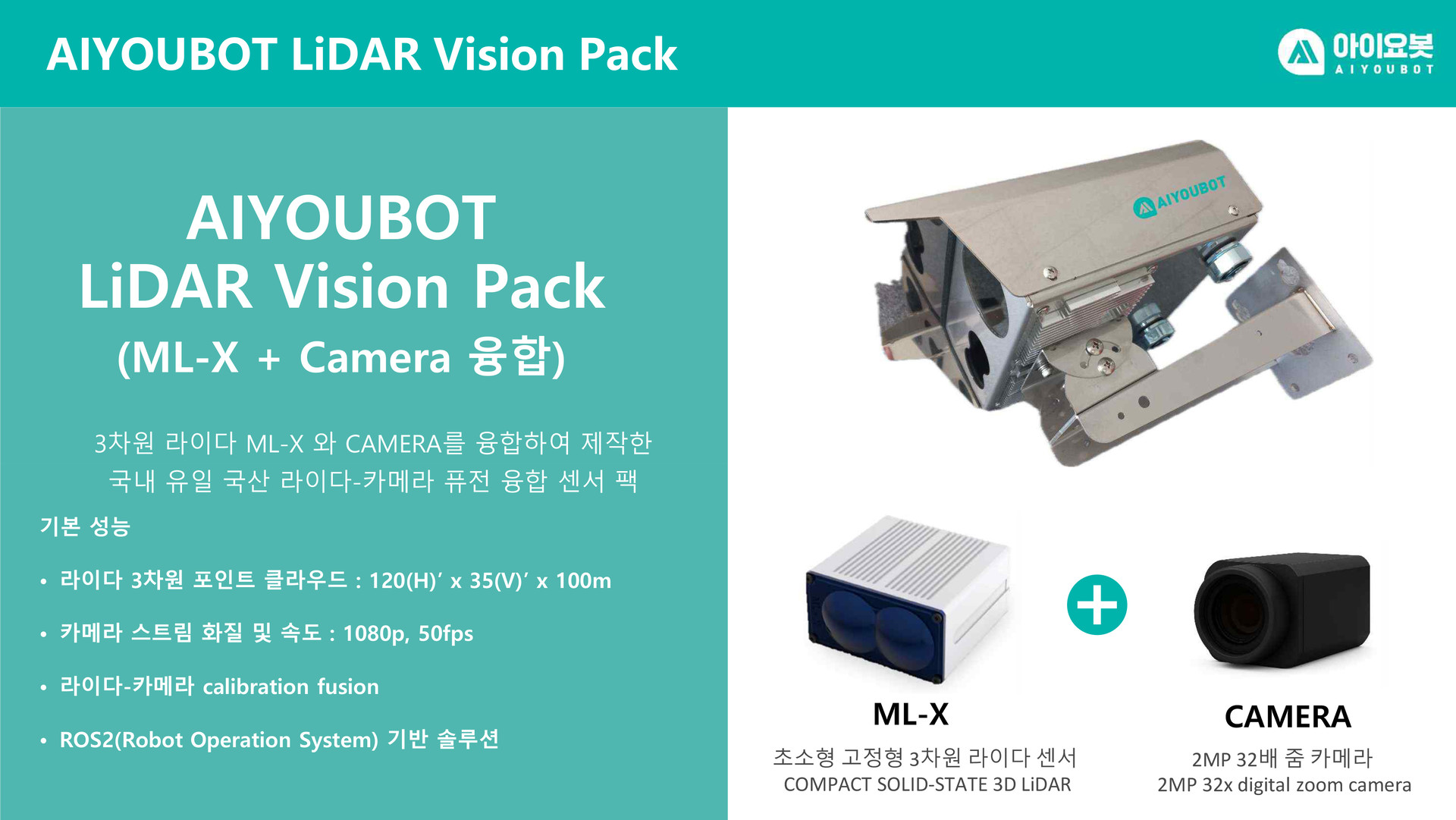 아이요봇 라이다 비젼 팩은 3D 라이다 ML-X와 CAMERA를 융합하여 제작한